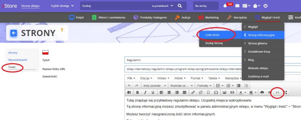 3. Po wybraniu strony w lewym menu dostępnych opcji przełącz widok na „treść”, a następnie w oknie edytora (centralnej części widoku ekranu) wybierz znak „< >”. Spowoduje to przełączenie edytora z graficznego (widoku) na HTML (kodu).