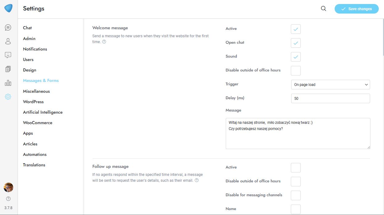 Możesz nie tylko zdefiniować treść początkowej wiadomości, ale również czy w momencie załadowania strony po raz pierwszy czat powinien rozwinąć się automatycznie z natychmiast widoczną wiadomością, oraz czy pojawienie się wiadomości powinno wygenerować dźwięk charakterystyczny dla standardowych wiadomości przychodzących. Jeśli nie chcesz, by wiadomość powitalna wyświetlała się poza godzinami pracy, możesz wybrać również tą opcję.