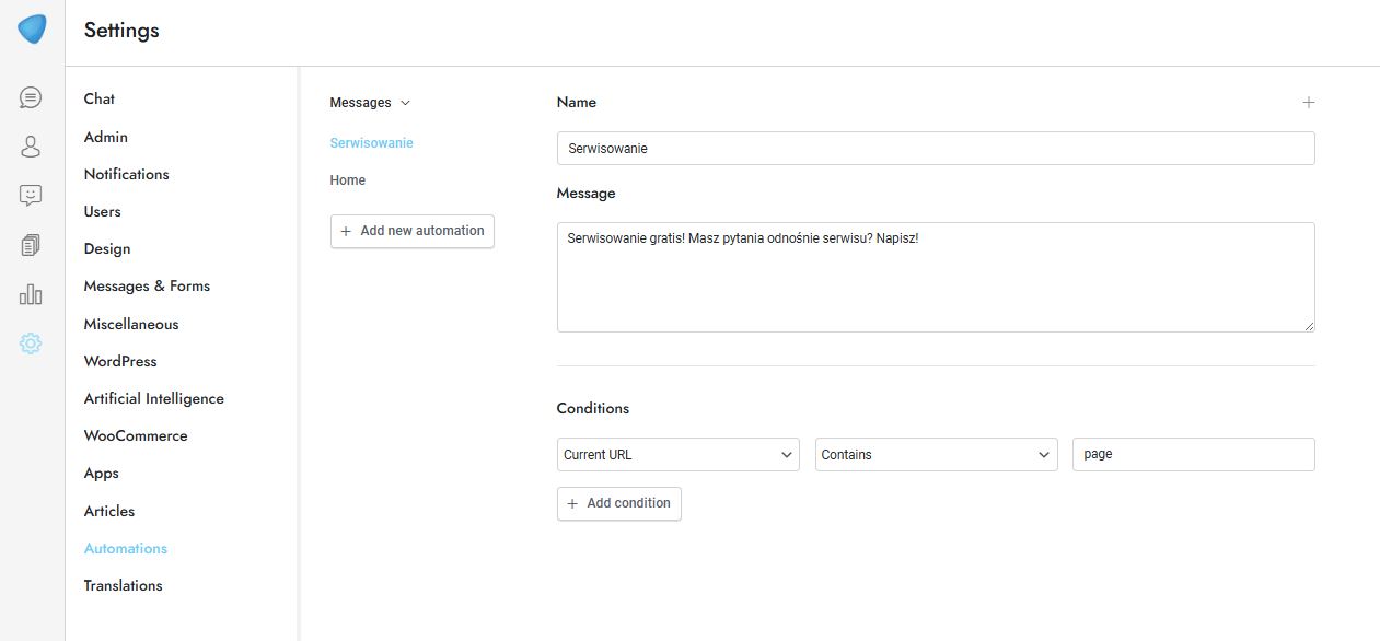 9. Czat wyświetla określone wiadomości na określonych stronach