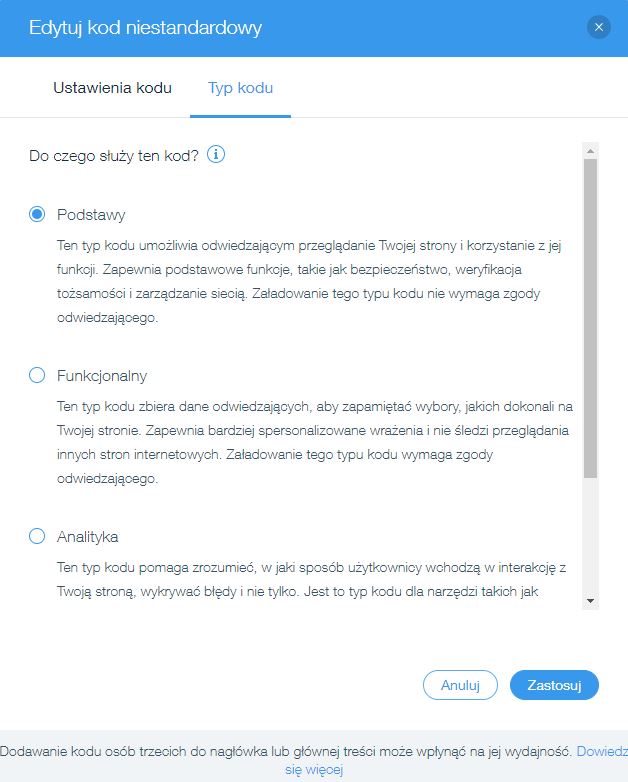5. Ustaw typ kodu, jaki umieściłeś na swojej domenie. Aby to zrobić na górze okienka zmień zakładkę na „typ kodu” i wybierz jedną z trzech domyślnych wersji.