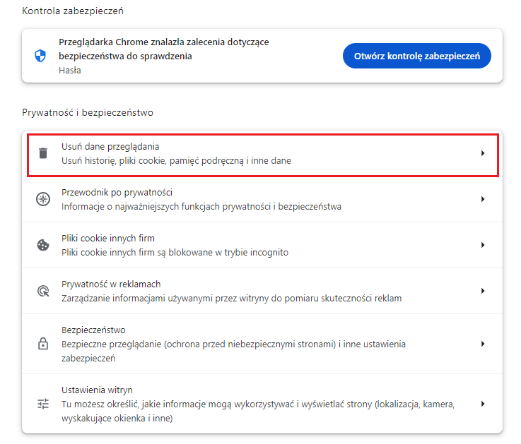 Na stronie „Prywatność i bezpieczeństwo” poszukaj sekcji zatytułowanej „b„. Kliknij na tę opcję, aby otworzyć okno dialogowe, w którym możesz wybrać, jakie dane chcesz usunąć.