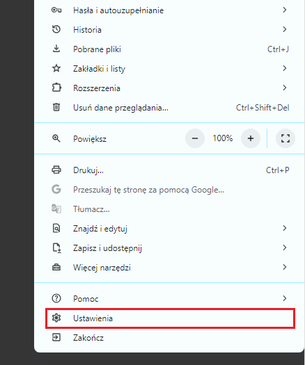 Z rozwijanego menu wybierz opcję „Ustawienia”, aby otworzyć panel konfiguracyjny przeglądarki.