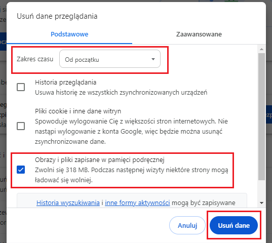 Po zaznaczeniu odpowiednich opcji, kliknij przycisk „Usuń dane”. Proces ten usunie zapisane pliki pamięci podręcznej, co może rozwiązać problemy z wyświetlaniem stron w sklepie Vendero.