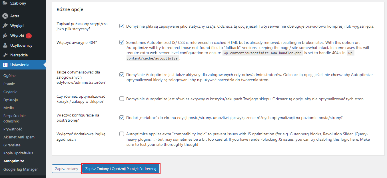 Czyszczenie pamięci cache WordPress – Autoptimize