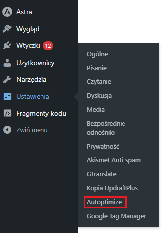 W rozwiniętym menu wybierz opcję „Autoptimize„.