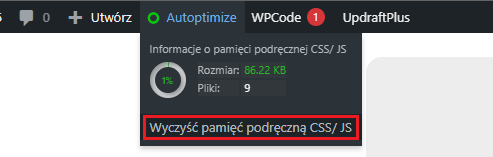 W rozwiniętym menu kliknij opcję „Wyczyść pamięć podręczną CSS/JS„. Ta operacja natychmiast usunie zgromadzone pliki cache, co może pomóc w rozwiązywaniu problemów związanych z wyświetlaniem treści i zwiększyć wydajność strony.