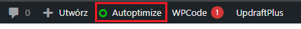 Na dowolnej stronie panelu, w górnym pasku narzędzi, znajdziesz zakładkę „Autoptimize„. Najedź na nią kursorem, aby rozwinąć menu.
