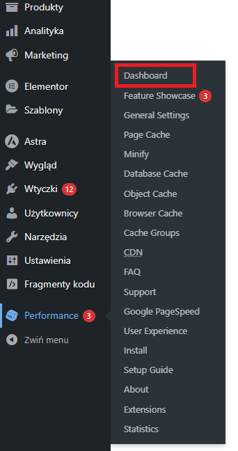 Najedź kursorem na zakładkę ‘Performance’, aby rozwinąć menu, a następnie kliknij opcję “Dashboard”. Zostaniesz przekierowany do panelu ustawień wtyczki W3 Total Cache.