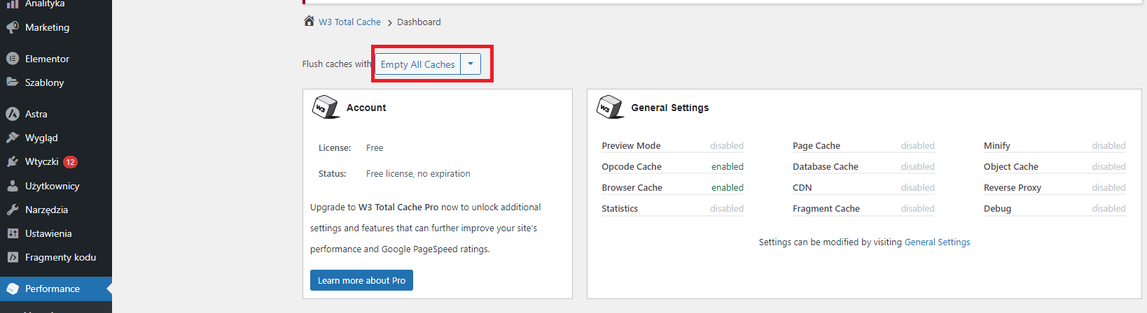 Czyszczenie pamięci Cache WordPress – W3 Total Cache