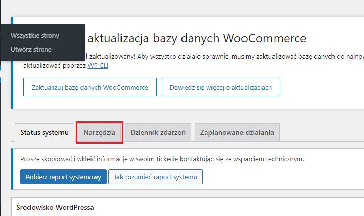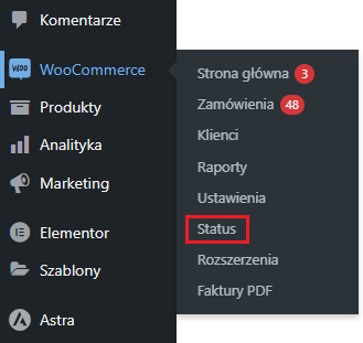 W rozwiniętym menu kliknij opcję „Status„. To tutaj znajdują się narzędzia diagnostyczne, które pozwolą Ci zarządzać pamięcią podręczną WooCommerce.