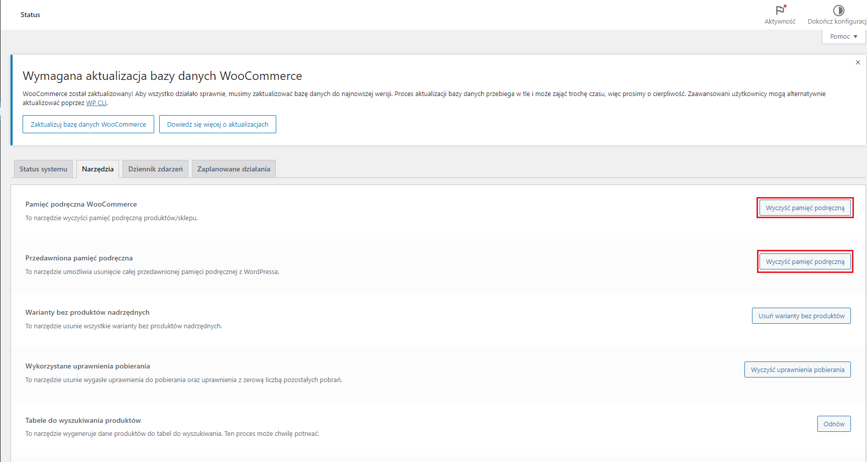 Znajdź pola oznaczone jako „Pamięć podręczna WooCommerce” oraz „Przedawniona pamięć podręczna„. To właśnie te obszary pamięci mogą czasem wymagać odświeżenia, aby sklep działał poprawnie.