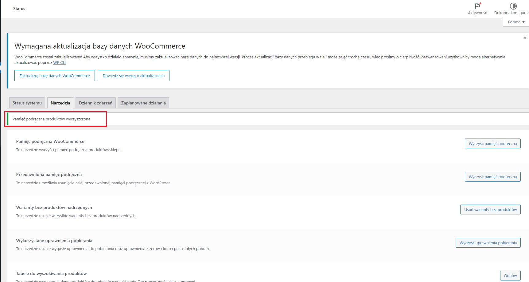 Jeśli wszystko przebiegło pomyślnie, na górze strony pojawi się komunikat „Pamięć podręczna produktów wyczyszczona„. Komunikat ten znajdziesz tuż nad opcją „Pamięć podręczna WooCommerce„.
