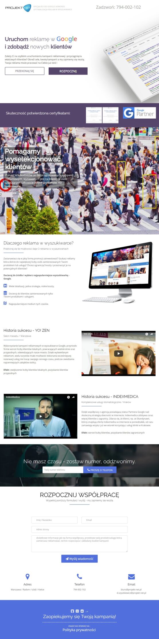 Strona Landing-Page Adwords Projekt-Net została wykonana na potrzeby firmy, aby skupić uwagę odbiorców na ofercie wykonania kampanii AdWords dla stron i sklepów.