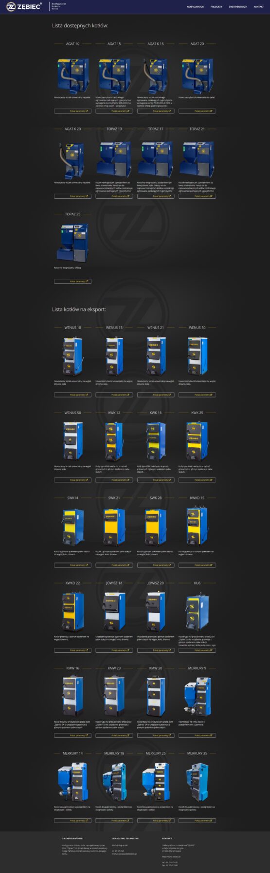 Zakłady Górniczo-Metalowe „Zębiec” w Zębcu Spółka Akcyjna to firma oferująca wysoko wydajne kotły c.o. do ogrzewania domów, pomieszczeń gospodarczych, sklepów i pawilonów handlowych. Dodatkowo spółka Zębiec zajmuje się również produkcją i dystrybucją niezbędnych produktów dla budownictwa, wiertnictwa oraz odlewnictwa. Na zlecenie spółki wykonaliśmy stronę Konfiguratora pozwalającą użytkownikom na zawężenie wyboru prezentowanych kotłów dzięki podawaniu kolejnych