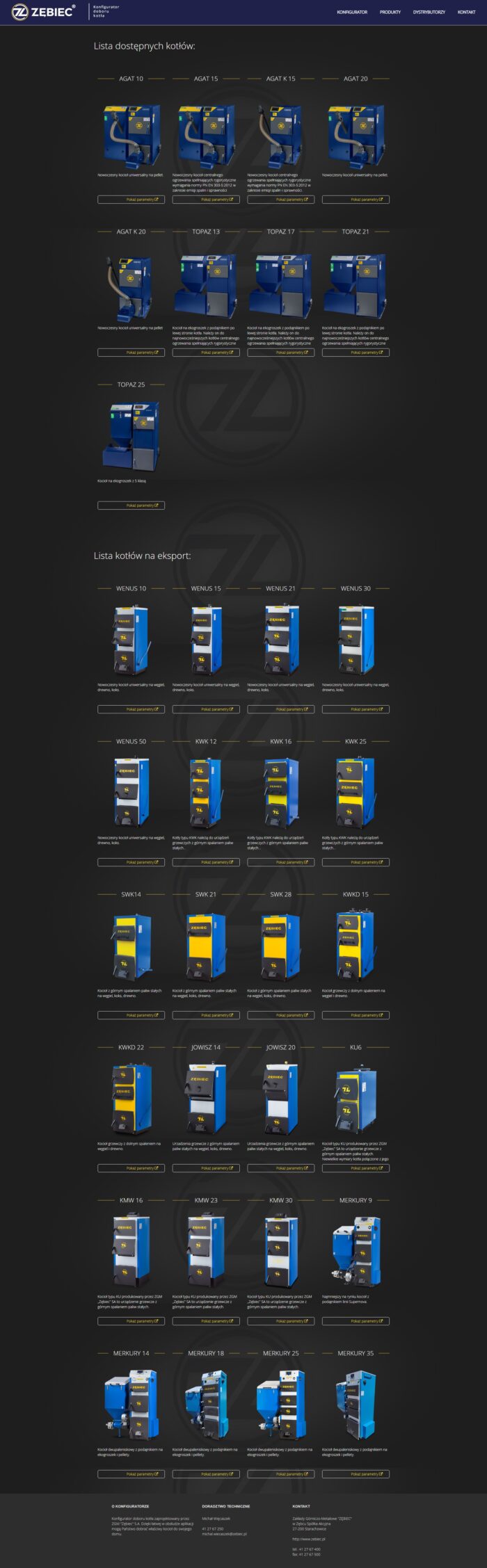 Na zlecenie spółki wykonaliśmy stronę Konfiguratora pozwalającą użytkownikom na zawężenie wyboru prezentowanych kotłów dzięki podawaniu kolejnych parametrów, które produkt powinien zawierać
